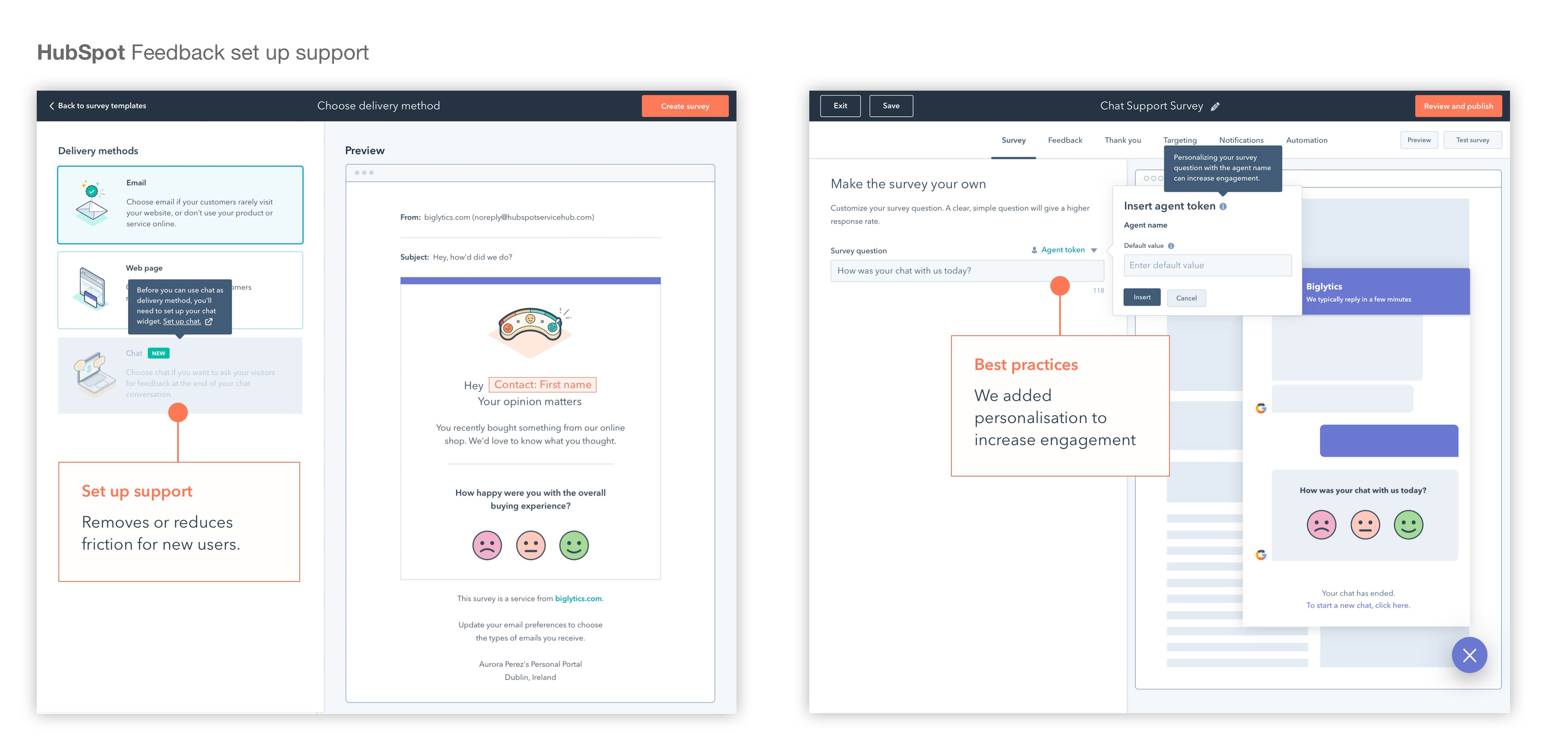 Throughout our design iteration process, we presented our work to designers in other teams to gather feedback from our UX counterparts. They offered different perspectives which were helpful as we were thinking through the joint configuration experience between the two HubSpot tools (Chat and Feedback).